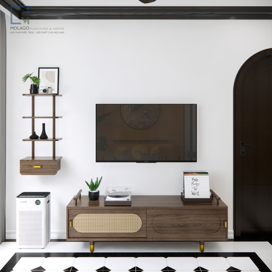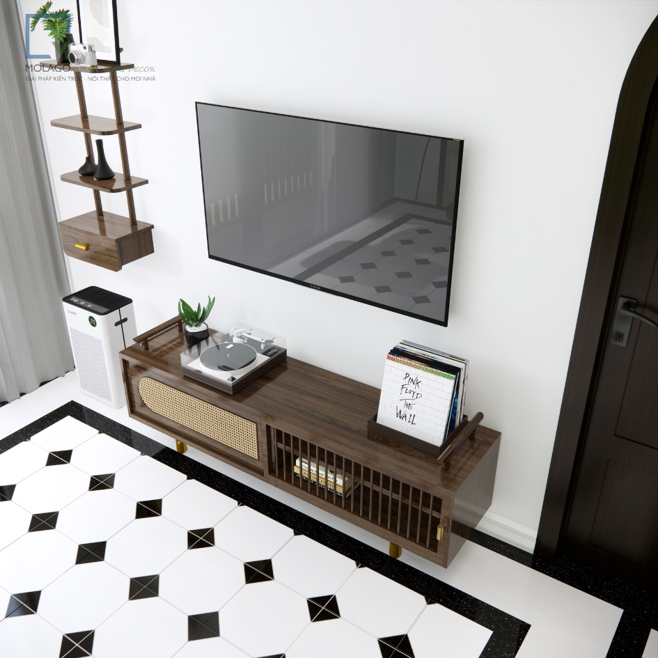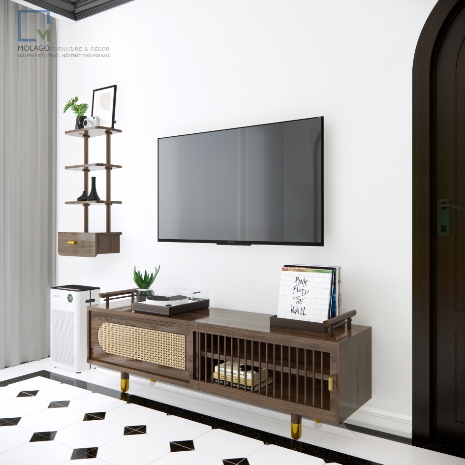 - Kích thước: Tủ Tivi có kích thước chuẩn để phù hợp với các loại tivi hiện đại, trong khi Kệ Trang Trí có kích thước lý tưởng để treo tường, tiết kiệm diện tích và làm đẹp không gian.